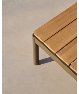 ARIO 150x63 cm grüner Couchtisch aus Aluminium mit Teakholzplatte für die Gartenterrasse im Freien