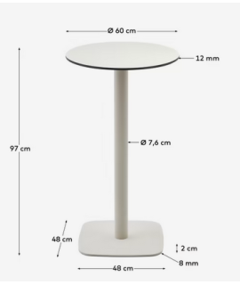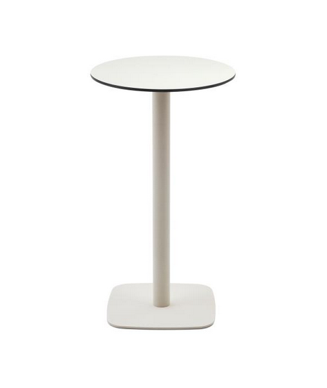 Ein schöner, eleganter, praktischer und widerstandsfähiger hoher Tisch. Ideal für Bars, Restaurants, Hotels, aus weiß pulverbeschichteter Stahl-Rundsäule. Runde Platte aus weißem HPL, ein sehr praktisches Material, beständig gegen Flecken, Stöße und Abrieb, hohe Temperaturen, antibakteriell und besonders für den Außenbereich geeignet.
