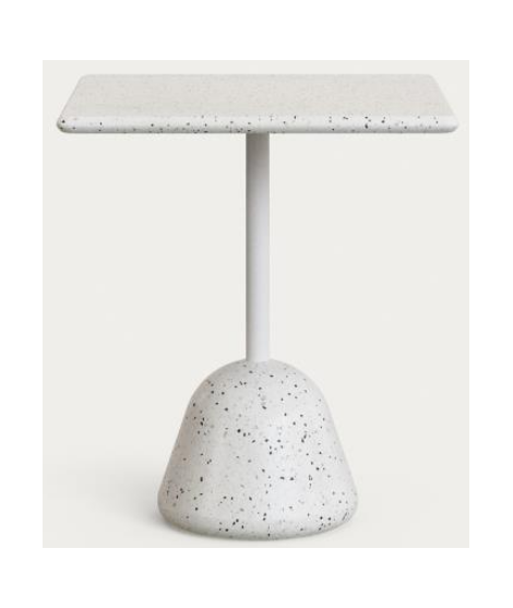 Praktischer und raffinierter Tisch. Hergestellt mit einer runden Säule aus Weiß pulverbeschichtetem Metall und einem Betonsockel darunter, Ø 41. Quadratischer Platte aus venezianischem Terrazzobeton, Höhe 3,5 cm. Neben dem trendigen Design zeichnen sich die verwendeten Materialien durch eine hohe Beständigkeit gegen äußere Einflüsse, Witterungseinflüsse und UV-Strahlung aus. Geeignet für den Außen- oder Innenbereich, zu Hause oder in Bars, Geschäften, Eisdielen, Cafés, Restaurants, Strandlokalen, Hotels und Strandresorts. Zum Schutz des Bodens ist der Tisch mit einem Gummifuß ausgestattet. Alle Maße im technischen Datenblattfoto durch Scrollen mit dem Pfeil in den Fotos.