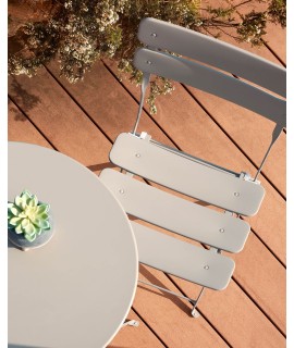 Ein angenehmer Klappstuhl mit einer frischen und modernen Linie, geeignet für Zuhause, Garten oder Terrasse, aber auch für Bars, Eisdielen, Cafés, Restaurants, B&Bs, Clubs, Hotels, Badeanstalten. Hergestellt aus einer taubengrau lackierten Metallstruktur. Perfekt für den Außenbereich, widerstandsfähig, praktisch, faltbar und einfach zu handhaben.
