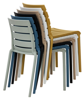 Stapelbarer Stuhl für Zuhause oder Bars, Eisdielen, Cafés, Restaurants, Strandbars, Hotels und Strandresorts. Hergestellt mit einem Polypropylen-Rahmen, erhältlich in verschiedenen Farben. Schlichte und klare Linien. Perfekt für den Außenbereich, da er äußerst langlebig, praktisch und einfach zu handhaben ist.