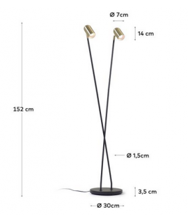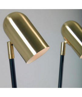 Eine wunderbare Stehlampe, elegant und Design. Hergestellt aus zwei schwarzen Metallstäben und mit goldenen Lampenschirmen. Eine essentielle und fesselnde Linie. Für alle Arten von Möbeln geeignet.