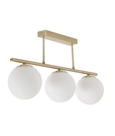Eleganter und raffinierter Kronleuchter aus goldfarbenem Metall mit drei emaillierten Glaskugeln. Es beleuchtet und streut das Licht auf überraschende Weise im ganzen Raum. Die Schönheit des Lampenschirms erzeugt eine angenehme und intime Wirkung.