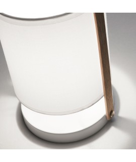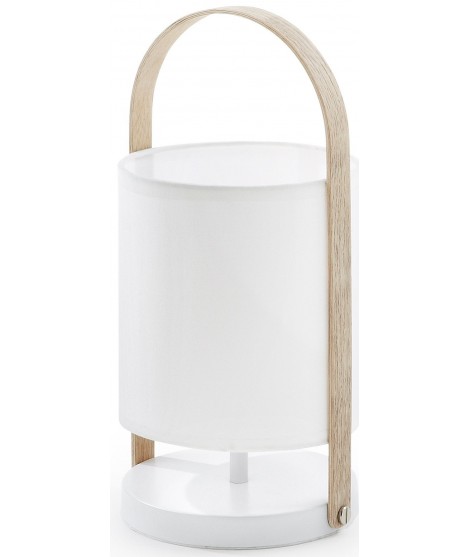 Anmutige Tischlampe in Form einer Laterne. Mit Lampenschirm aus Baumwollstoff, Metallstruktur und Dekor aus natürlichem Eschenholz. Schön, einfach und harmonisch, erinnert seine Linie an eine verzauberte Zeit, die der Märchen, eine Lampe, die uns zum Träumen bringt.