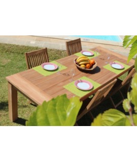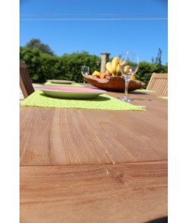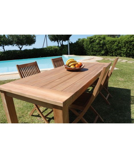 Fabulous rechteckiger fester Tisch ganz in Teakholz. Ein robuster und solider Tisch, der mit UV-Schutz nach PNZ-Öl behandelt wurde und für den Außenbereich geeignet ist. In regelmäßigen Abständen mit dem entsprechenden Teaköl geschützt werden. 3 cm starke Tischplatte. Bein mit quadratischem Querschnitt 10x10 cm. Edelstahlschrauben.