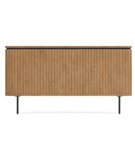 Schönes Kopfteil für Doppelbetten. Eine raffinierte Handwerkskunst, die Ihren Möbeln Raffinesse und Eleganz verleiht. Hergestellt aus massivem Mangoholz, bestehend aus aneinandergereihten Streifen mit Lamelleneffekt und einem faszinierenden Detail aus schwarzem Metall.