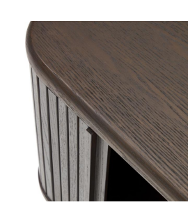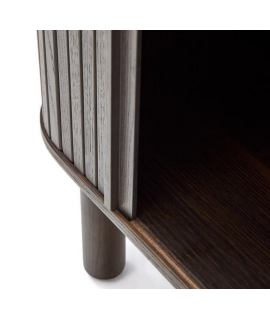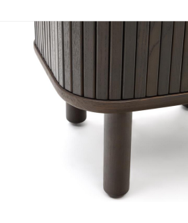 Attraktive Linie für diesen eleganten und repräsentativen Nachttisch. Mit 2 Schiebetüren und einer Struktur aus Esche dunkles Finish, die in nebeneinander angeordneten Lamellen angeordnet ist, was diesen Nachttisch zu einem einzigartigen Stück macht, das Wesentlichkeit und Raffinesse ausstrahlt. Ein wunderbares Einrichtungsaccessoire, das Helligkeit in die Umgebung überträgt.