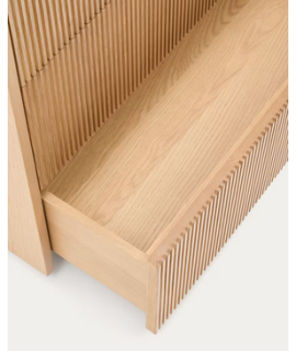 Schlichte und elegante Linie für diese Kommode aus Eichenfurnier. Mit 3 Schubladen mit Drucköffnung und versteckten Führungen. Der Lamelleneffekt der nebeneinander angeordneten Holzleisten macht dieses Möbelstück zu einem Unikat, das Schlichtheit und Raffinesse ausstrahlt. Ein wunderbares Einrichtungsaccessoire, das dem Raum Helligkeit verleiht.