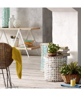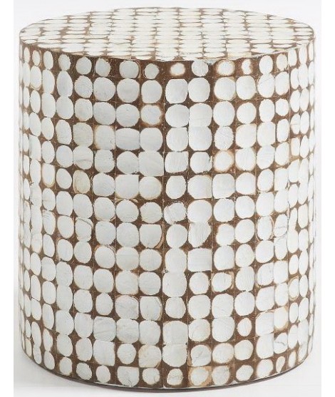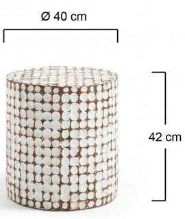 Ethnischen Geschmack dieser schönen Hocker. Aus massivem Holz, dient auch als Hocker oder Beistelltisch. Mit Holzspänen Kokosnuss abgedeckt. Sauber und einfach, ist sehr angenehm mit diesen weißen farbigen Flocken, die viel Helligkeit für die Umwelt bringen und die Atmosphäre eher intim und magisch. Ideal auch als Nachttisch.