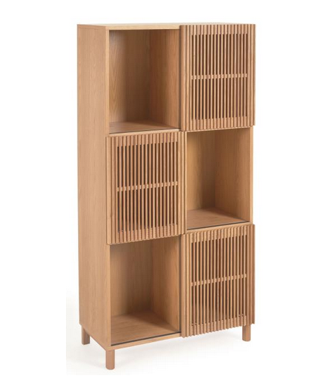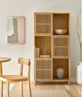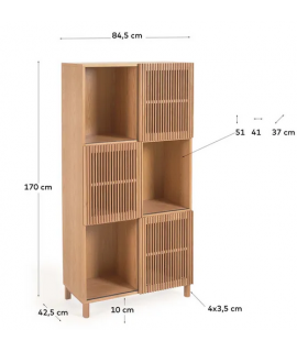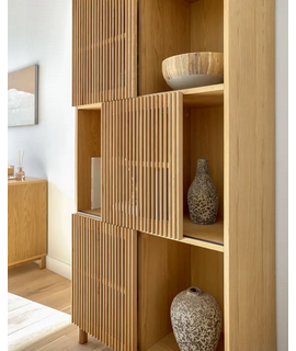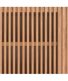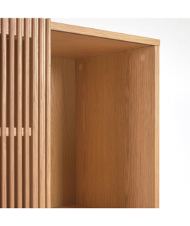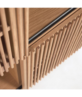 Raffiniertes Sideboard, ein angenehmer Kolonialstil mit einer raffinierten Verarbeitung von Lamellen, die ein Lichtspiel mit der natürlichen Essenz von Eichenholz erzeugt. Ein praktisches und geschmackvolles Sideboard.