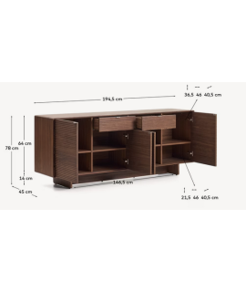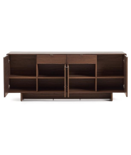Als Ergänzung zu einem einzigartigen und markanten Stück präsentieren wir hier ein elegantes und raffiniertes Sideboard mit minimalistischem Look, das den heutigen Einrichtungsbedürfnissen perfekt entspricht. Es verfügt über eine Struktur aus Walnussfurnier und eine Polyurethan-Lackierung für Verschleiß- und Feuchtigkeitsbeständigkeit. Es hat vier Türen mit Soft-Close-Scharnieren und zwei Schubladen mit verdeckten Schienen und einem griffbetätigten Öffnungssystem mit Soft-Close. Die Griffe bestehen aus satiniertem Edelstahl, wodurch Fingerabdrücke und Kratzer weniger sichtbar sind, und verfügen über ein abgeschrägtes Design für besseren Halt. Die Innenböden sind verstellbar. Das Holz stammt aus zertifizierter nachhaltiger Forstwirtschaft. Unten finden Sie passende Accessoires aus derselben Linie. Alle Maße sind im Foto des technischen Datenblatts dargestellt.