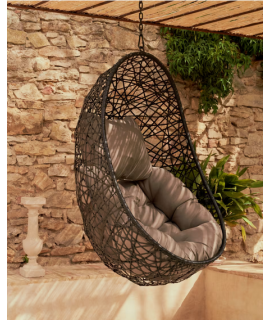 Bezaubernder Hängesessel aus handgeflochtenem Rattan, mit abnehmbaren Kissen und Stahlrahmen. Ein überraschendes Sesseldesign, ein modernes Design mit einem exotischen Touch. Eine Ästhetik, die von einem zeitgenössischen Stil inspiriert ist, der sich mit dem Kolonialstil vermischt, um einen innovativen und sehr bequemen Sessel hervorzubringen.