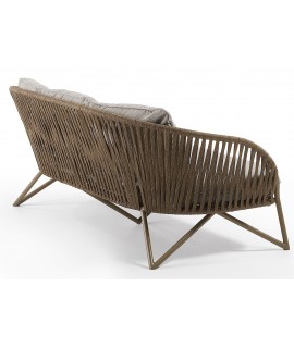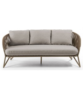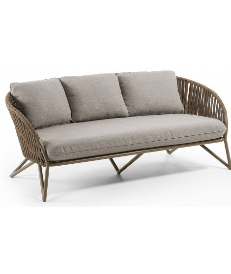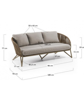 3-Sitzer-Sofa mit komfortabler und praktischer Funktionalität. Struktur aus braun verzinktem pulverbeschichtetem Stahl und Bearbeitung der Armlehnen und Rückenlehne aus UV-beständigem Polyesterseil. Bequeme und gut abgestützte Sitz- und Rückenküchen, die mit einem schönen praktischen und widerstandsfähigen Stoff bezogen sind. Siehe unter dem Sessel, um mit der gleichen Linie zu kombinieren. Auf dem Foto des Datenblattes sind alle Maßnahmen aufgeführt.