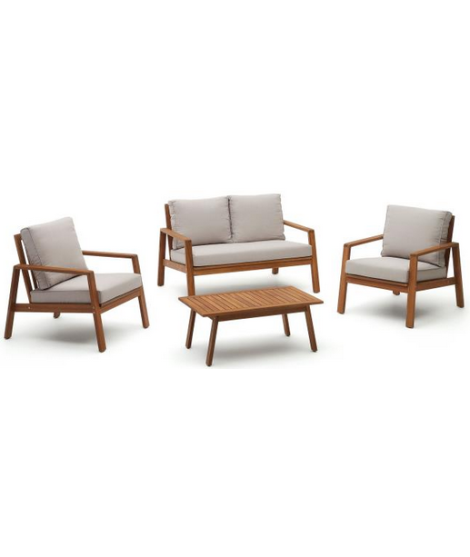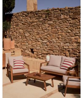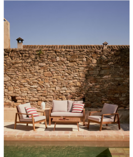 Wunderschönes Set bestehend aus: 2-Sitzer-Sofa, 2 Sessel und Couchtisch, in frischem und raffiniertem Design. Eine romantische Linie und ein charmanter Kolonialstil, der zum Träumen einlädt. Hergestellt aus massivem Akazienholzrahmen und UV-beständigem gewebtem Polyesterseil. Alle Kissen inklusive, aus wasserabweisendem und abnehmbarem Stoff. Charmant und raffiniert, wird es Sie mit seiner Ästhetik, seinem Komfort und seiner großen Widerstandsfähigkeit überzeugen, ideal für offene Räume.