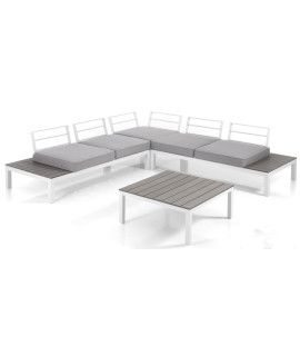 Faszinierendes und elegantes Set bestehend aus Ecksofa und Couchtisch. Hergestellt aus einer sehr widerstandsfähigen mattweiß lackierten Aluminiumstruktur, Couchtischplatte und Sofaregalen aus Polywood mit hellgrauem Walnuss-Finish und abnehmbaren und waschbaren hellgrauen Kissen inklusive. Vielseitig und raffiniert, sehr raffiniert. Designstark und mit starker ästhetischer Wirkung, ideal, um Ihre Außenbereiche stilvoll einzurichten und die Natur in Ihrem Garten oder Ihrer Terrasse bequem zu genießen.