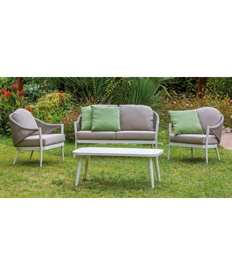 Der weiß pulverbeschichtete Aluminiumrahmen wird durch die Kombination aus taubenfarbenem Kunststoffseil und 230 g sandfarbenen Polyestergewebekissen aufgewertet.