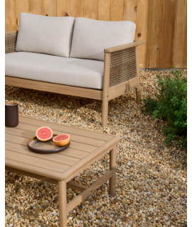 Wunderschönes Set bestehend aus: 2-Sitzer-Sofa, 2 Sessel und Couchtisch, in frischem und raffiniertem Design. Eine romantische Linie und ein charmanter Kolonialstil, der zum Träumen einlädt. Hergestellt aus massivem Akazienholzrahmen und UV-beständigem Kunstrattan. Alle Kissen inklusive, aus wasserabweisendem und abnehmbarem Stoff. Charmant und raffiniert, wird es Sie mit seiner Ästhetik, seinem Komfort und seiner großen Widerstandsfähigkeit überzeugen, ideal für offene Räume.