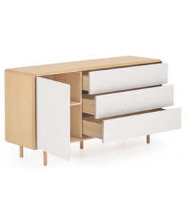 Raffiniertes Sideboard, eine raffinierte Handwerkskunst, die Ihren Möbeln Raffinesse verleiht. Hergestellt mit Struktur und Beinen aus Massivholz und mit 1 Tür und 3 Schubladen aus Eschenfurnier mit Drucköffnung, grauweiß lackierte Front. Ein schönes und praktisches Sideboard.