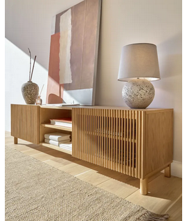 Schöner und raffinierter TV-Schrank, strukturiert aus massivem Eichenholz und Eichenfurnier, mit 2 Klapptüren, 2 offenen Fächern, praktischen Kabelführungen und Massivholzfüßen mit Kunststoffösen zum Schutz des Bodens. Wenn Nützlichkeit und guter Geschmack zusammenkommen und einem fabelhaften Fernsehschrank Leben einhauchen, der sich in jeder Art von Möbel hervorheben kann. Unter den Accessoires der gleichen Linie passend. Alle Maße sind auf dem Foto des Datenblattes.