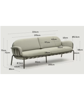 Bequemes und raffiniertes 3-Sitzer-Sofa, geeignet für den Außen- oder Innenbereich dank der praktischen Anwendbarkeit der Materialien, aus denen es hergestellt wird. Leichte Aluminiumstruktur, hergestellt in lokalen Werkstätten, reduziert die CO2-Emissionen für eine geringere Umweltbelastung. Polyurethan-Polsterung mit gestütztem Sitz und abnehmbarem und maschinenwaschbarem Stoffbezug. Maximale Kapazität 300 Kg. Unten finden Sie alle passenden Zubehörteile der gleichen Linie. Alle Maße sind auf dem Foto des technischen Datenblatts.
