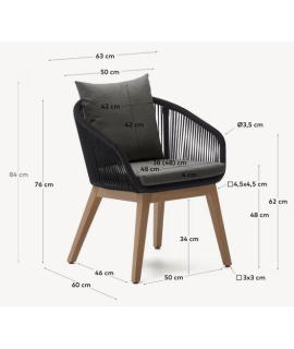 Fabelhafter Stuhl mit Armlehnen mit Struktur aus massivem Akazienholz, behandelt mit PNZ-Öl für lange Lebensdauer und UV-Schutz, Bezug aus Polyesterseil, beständig gegen UV-Strahlen und schlechtes Wetter, Kissen aus wasserabweisendem Stoff, vollständig abnehmbar und waschbar. Maximale Kapazität 130 Kg. Auf dem Foto des Datenblatts sind alle Maßnahmen aufgeführt.