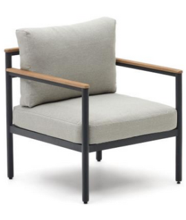 Das Wohnzimmer-Set besteht aus: 1 2-Sitzer-Sofa, 2 Sessel und 1 Couchtisch. Mit Rahmen und Details aus Aluminium und Tischplatte aus massivem Akazienholz und Kissen mit taubengrauem Stoff bezogen. Ideal für den Außenbereich, da die Materialien sehr witterungsbeständig sind. Eine frische Designlinie.