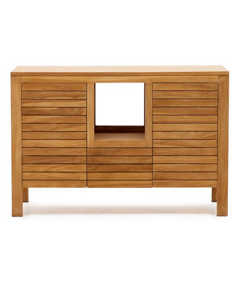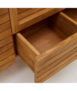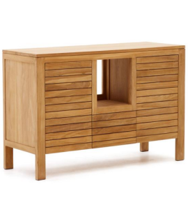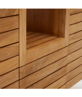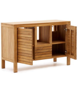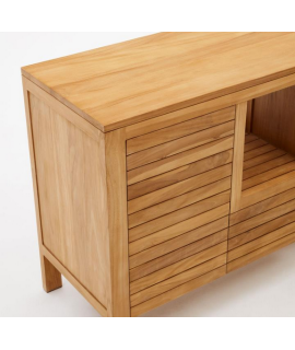 Fesselnde Linie für dieses elegante und prestigeträchtige Sideboard. Aus massivem Teakholz gefertigt, eignet er sich dank der sehr hohen Widerstandsfähigkeit des Materials, aus dem er gefertigt ist, nämlich Teakholz, auch ideal als Badezimmerschrank. Mit 2 Türen mit Nutöffnung und Mittelfach. Ein wunderbares Möbelstück, das Helligkeit an die Umgebung überträgt. Fantasievoll und raffiniert, düster und dynamisch, konzentriert es sich auf Praktikabilität und ein elegantes Design.