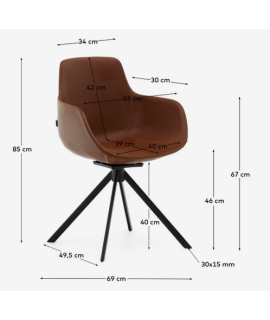 Dieser bequeme Schreibtischstuhl hat ein innovatives Design. Hergestellt mit einer drehbaren Struktur, schwarzen Stahlbeinen, bequemer Polsterung und einem sehr praktischen braunen Kunstlederbezug. Ein Bürosessel mit einer ergonomischen Linie, die maximalen Komfort garantiert. Auf dem Foto des technischen Datenblattes sind alle Maße aufgeführt.