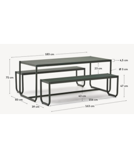 Fabelhaftes Set bestehend aus einem Tisch und zwei Bänken aus verzinktem Stahl mit grünem Finish, 100 % Material, das für den Außenbereich geeignet ist. Beständig gegen Oxidation und Korrosion. Eine frische Linie, die Eleganz und Funktionalität in Ihre Außenumgebung bringt.