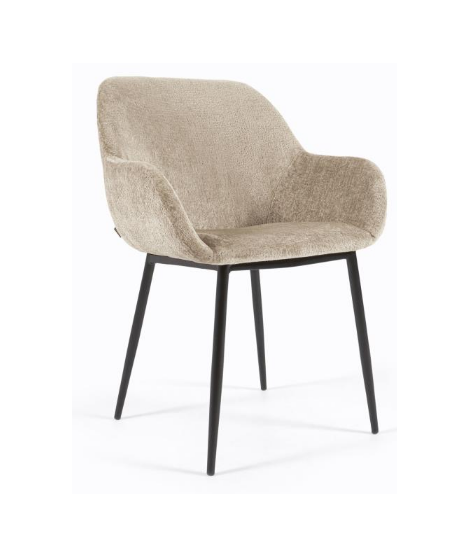 Charmanter Stuhl mit Armlehnen, um Ihren Moment der Entspannung zu genießen und sich verwöhnen zu lassen. Schöner Bezug, angenehm im Griff, aus Chenille Beige und solide Basis aus schwarz lackiertem Metall. Eleganz und Komfort an Ihren Fingerspitzen. Maximale Kapazität 130 kg. Auf dem Foto des Datenblatts sind alle Maßnahmen aufgeführt.