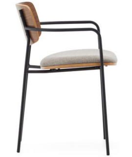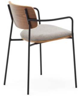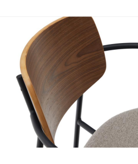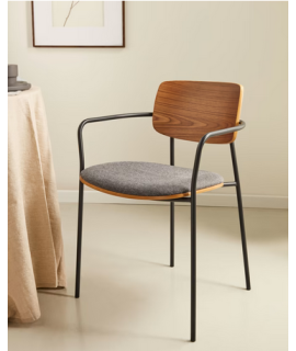 Stapelbarer Stuhl mit Armlehnen, mit Struktur aus Walnussfurnier und Schwarz Metall. Wesentlich, aber äußerst stabil: Dies ist das Element, das diesen Stuhl mit seinem einfachen und faszinierenden Design auszeichnet. Modern und funktionell ist er bequem mit einem bequem gepolsterten, mit Stoff bezogenen Sitzkissen. Seine Linearität und Farben machen es vielseitig und innovativ.