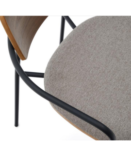 Ein moderner, schöner und bequemer, einfach zu handhabender und leichter Stuhl mit Armlehnen eignet sich für das Wohnzimmer oder das Arbeitszimmer. Raffiniert und gewagt, aber neben dem Design auch sehr bequem. Struktur aus Schwarz lackiertem Metall und Walnussfurnier, mit gepolstertem Kissen auf der mit Stoff bezogenen Sitzfläche. Von großem Prestige und Solidität. Maximale Tragfähigkeit 130 kg. Auf dem Foto des technischen Datenblattes sind alle Maße aufgeführt.