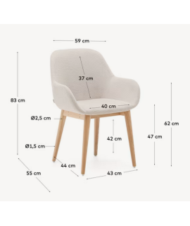Charmanter Stuhl mit Armlehnen, um Ihren Moment der Entspannung zu genießen und sich verwöhnen zu lassen. Bel mit trendiger Polsterung aus aus cremefarbenem Stoff und Beine aus massiver natürlicher Esche. Eleganz und Komfort an Ihren Fingerspitzen. Maximale Kapazität 130 kg. Auf dem Foto des Datenblatts sind alle Maßnahmen aufgeführt.
