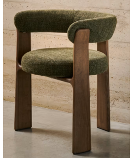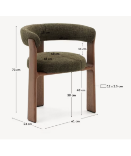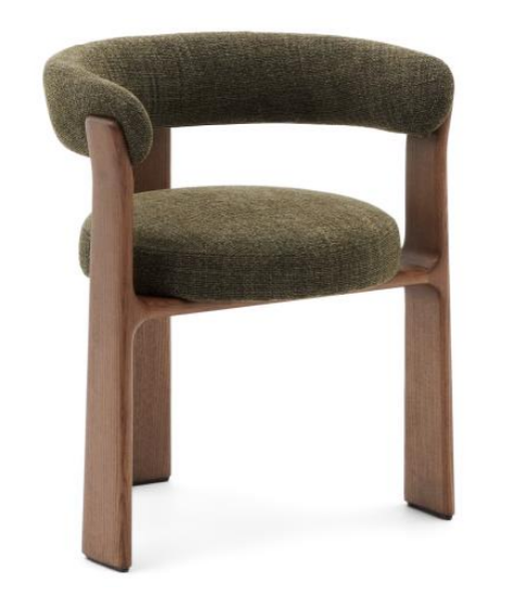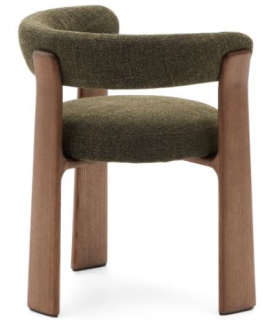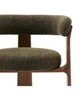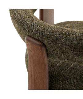 SERIFOS 3 beiniger Stuhl mit Armlehnen aus grünem Stoff mit Chenille-Effekt und Beinen aus Eschenholz mit Walnuss Finish