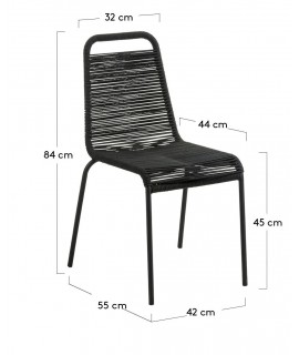 Einfacher und bezaubernder Stuhl mit einer Struktur aus schwarzem epoxylackiertem Metall, Sitz und Rückenlehne aus Polyester-Seil, stark und widerstandsfähig, mit einer angenehmen horizontalen Funktion. Erhältlich in den Farben: Sand oder Schwarz. Geeignet für den Außenbereich. Nachfolgend finden Sie den passenden Hocker. Alle Maße auf dem Foto des technischen Datenblatts durch Scrollen mit dem Pfeil in den Fotos.