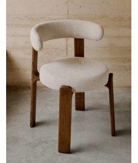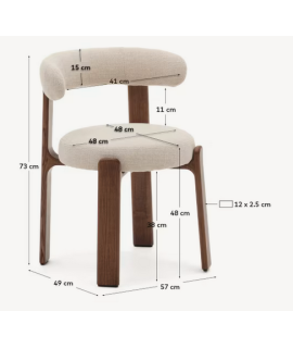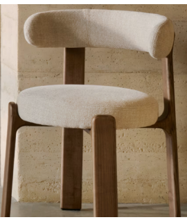 Schöner und solider Stuhl mit eleganter Linie und neuem Look, inspiriert vom skandinavischen Stil der 70er Jahre. Es ist sehr raffiniert und verfügt über eine robuste Struktur aus massivem Eschenholz mit Walnuss Finish. Es besticht sowohl durch seine Ästhetik als auch durch seinen Komfort. Mit gepolsterter Sitzfläche und Rückenlehne, bezogen mit beigem Stoff in Chenille-Optik. Faszinierend, mit schlichtem Design und starkem Charakter.