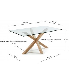 Raffinierter und eleganter rechteckiger feststehender Tisch mit Beinen aus naturholzlackiertem Stahl und transparenter Platte aus gehärtetem Glas. Erhältlich in drei Größen. Alle Maße sind auf dem Foto des Datenblattes.