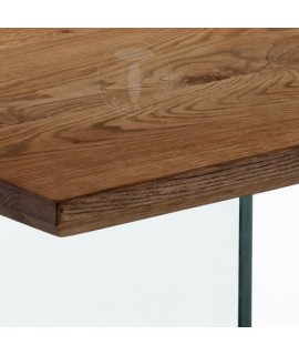 Fabelhafter rechteckiger fester Tisch. Mit 15 mm starker transparenter Hartglasplatte und 4 cm starker massiver Eichenholzplatte. Geeignet für alle Arten von Umgebungen, von klassisch bis modern, für die Küche, das Wohnzimmer oder Geschäfte, Büros oder Studios. Abstand zwischen Kopf mit Bein 35 cm und Beinabstand zum Bein 107 cm.