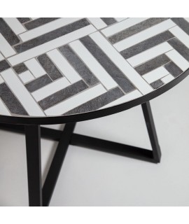 Die Struktur der vier ineinandergreifenden Beine besteht aus verzinktem Stahl, der gegen Rost, Korrosion und UV-Strahlen beständig ist. Die Oberseite besteht aus weißen und schwarzen Fliesen. Ein wunderbarer Tisch, der dank seiner Materialien praktisch und widerstandsfähig ist und auch in einer überdachten Außenumgebung verwendet werden kann.