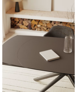 Moderner, charmanter, eleganter und großer Tisch, ausziehbar mit einfachem Öffnen durch einfaches Drehen der Platte. Gewundene, wichtige und solide gekreuzte schwarze Stahlbasis. Schönes Top aus schwarz gehärtetem Glas. Für Ihre Umgebung, um sie noch raffinierter und geschmackvoller zu machen.