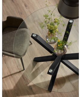 Harmonischer, eleganter und raffinierter Tisch mit gekreuzter Basis in schwarzem Stahl- oder Holzeffekt. Runde Oberseite aus transparentem gehärtetem Glas. Ein wirklich einladender, einzigartiger und faszinierender Tisch, an dem Design und Stabilität ihn auszeichnen. Ein attraktiver und moderner Look.