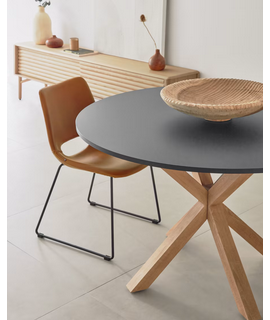 Harmonischer, eleganter und raffinierter Tisch mit gekreuzter Basis aus holzfarbenem Stahl und schwarzer runder Platte mit hoher Beständigkeit gegen Schnitte und Flecken. Ein wirklich einladender, einzigartiger und faszinierender Tisch, an dem Design und Stabilität ihn auszeichnen. Ein attraktiver und moderner Look.