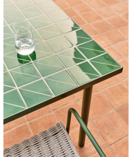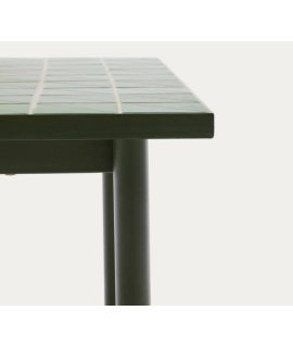 Seine Struktur mit vier umlaufenden Beinen sorgt für eine gute Tragfähigkeit. Sie ist aus grün lackiertem, verzinktem Stahl gefertigt, der beständig gegen Rost, Korrosion und UV-Strahlen ist. Die Oberseite besteht aus Fliesen. Ein wunderbarer Tisch, der dank seiner Materialien praktisch und widerstandsfähig ist und auch in überdachten Außenbereichen verwendet werden kann. Alle Maße im technischen Datenblattfoto durch Scrollen mit dem Pfeil in den Fotos. Nachfolgend finden Sie alle Elemente der gleichen Linie.