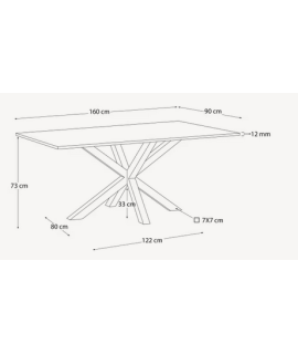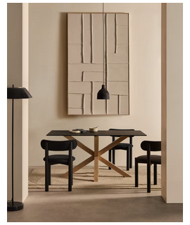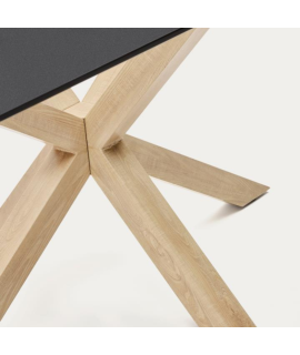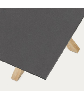 Raffinierter und eleganter rechteckiger feststehender Tisch mit Beinen aus naturholzlackiertem Stahl und schwarzer Platte aus gehärtetem Glas. Erhältlich in drei Größen. Alle Maße sind auf dem Foto des Datenblattes.