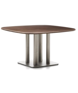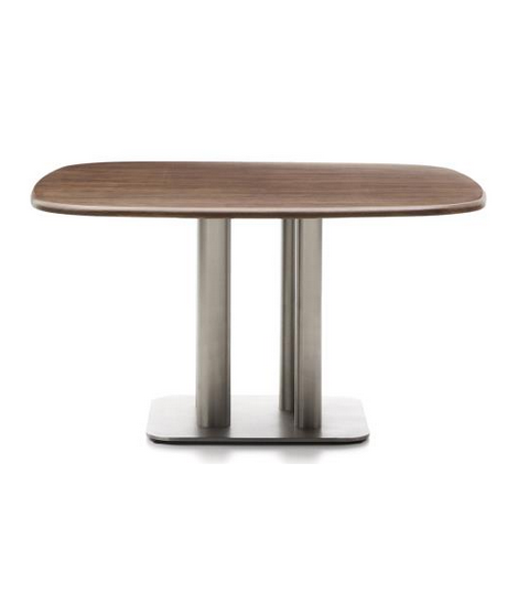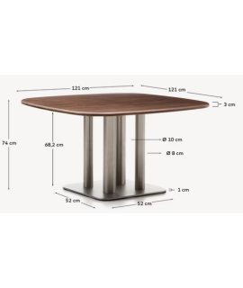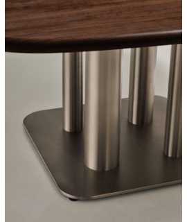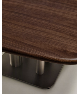 Ein imposanter und repräsentativer Tisch, der beim Betreten eines Raumes auffällt. Erhältlich in verschiedenen Größen. Die Tischplatte aus natürlichem Walnussfurnier und das Gestell aus gebürstetem Edelstahl verleihen dem Raum Stil, Raffinesse und Eleganz.