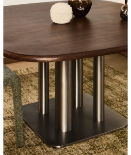 Ein atemberaubender, feststehender Tisch. Die Platte besteht aus Walnussfurnier mit Polyurethan-Lackierung, die für Verschleißfestigkeit und Feuchtigkeitsbeständigkeit sorgt. Das Gestell besteht aus gebürstetem Edelstahl. Er verfügt über verstellbare Füße, um Bodenunebenheiten auszugleichen. Das Holz stammt aus zertifizierter Forstwirtschaft. Seine Abmessungen wirken einladend und einladend. Minimalistisch und innovativ elegant, passt er zu modernem Dekor. Kombinieren Sie ihn mit anderen Accessoires aus der gleichen Kollektion. Alle Maße finden Sie im technischen Datenblatt, indem Sie mit dem Pfeil durch die Fotos scrollen.