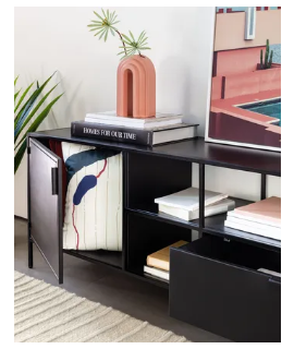 Kleiner TV-Schrank, schön und praktisch. Hergestellt aus schwarz lackierter Metallstruktur, mit einer Tür mit Magnetverschluss und einer Schublade. Ein minimalistischer Stil mit starkem Charakter, der mit raffiniertem Geschmack einrichtet, ideal für eine junge Umgebung, ein essentieller, praktischer und funktionaler Look. Unter allen Ergänzungen dieser Linie. Alle Maße auf dem Foto des technischen Datenblatts durch Scrollen mit dem Pfeil in den Fotos.