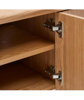 Klare Linien und abgerundete Formen prägen dieses TV-Ständer mit vier Türen und sanftem Schließsystem. Es besteht aus Eschenholz mit natürlichem Finish, das jedem Stück eine einzigartige Identität verleiht, in der die charakteristischen Details des Holzes hervorgehoben werden. Dank der Vielseitigkeit seines Designs passt es sich perfekt an jede Art von Möbeln an und verleiht der Umgebung Helligkeit.