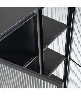Vitrina de fantasía hecha de metal negro y vidrio templado. Un diseño simétrico, una línea esencial y minimalista para este mueble con múltiples funciones. Fabuloso como aparador o librería, práctico para guardar. Con un estilo industrial intrigante y funcional, un diseño moderno que decora gratamente el hogar u oficina.