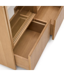 Línea sencilla y elegante para esta vitrina, fabricada en chapa de roble y vidrio templado. Cuenta con 4 puertas correderas y 2 cajones con apertura a presión y guías ocultas. El efecto de listones de madera, dispuestos uno junto al otro, convierte este mueble en una pieza única que irradia esencialidad y refinamiento. Un magnífico complemento de decoración que aporta luminosidad al ambiente.